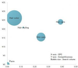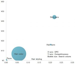 また「ヘアカラー」は、検索エンジンマーケティングをした時に同じキーワードのクリック単価(CPC)と競合(どれくらいそのキーワードが買われているか)のデータを可視化してみても、最も新規参入しやすいことが分かりました。