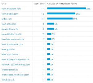香港でも、ヘアケア系のブランド名やコスメ関連のキーワードが出現しているSNSはInstagramが第1位でした。しかし割合としては29%と比較的少なく、30%を切っています。また第2位はYAHOO!JAPANに似たソーシャルメディアのtheZtyle(ザジータイル)が12%で、第3位のTwitterの11%をわずかに上回っています。ほかにも中国を代表するポータルサイトsohu(そうふ、ピンイン)などが上位に入っています。