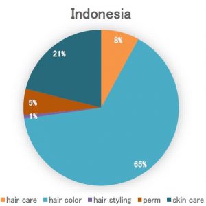 すると一番多かったのが、タイで第1位だった「ヘアカラー」の65%でした。第2位は先進国で多くなる傾向がある「スキンケア」の21%でしたが、これはインドネシアの美容産業が先進国並みに成熟しているのではなく、欧米圏のマーケティングが浸透していることに起因しているのではないかと思われます。と言うのも、タイには昔から美容関連の産業がありましたが、インドネシアの美容産業はまだ新しいからです。