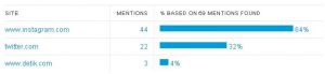 最後に、インドネシアでヘアケア系のブランド名やコスメ関連のキーワードが出現しているSNSを見てみましょう。下の一覧は出現数が多い順に並べたものですが、第1位のInstagramが44%、第2位のTwitterが22%、そしてインドネシアの大手ポータルサイトdetik(デティック)が3%と、3つしかありませんでした(ちなみにFacebookはプライベートアカウントも多いため、データが反映されていない可能性があります)。やはりInstagramは強いですね。