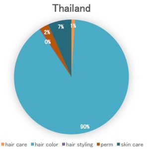 続いて今回も、化粧品関連の単語の中で「ヘアケア、ヘアカラー、ヘアスタイリング、スキンケア、パーマ」という5つのキーワードがどれくらい検索されたか、それぞれが占める割合を調べてみました。するとタイで圧倒的に多かったのが「ヘアカラー」の90%で、ほとんどの人が関心を寄せているということが分かりました。