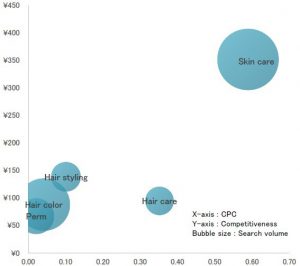 また「ヘアカラー」は、検索エンジンマーケティングをした時に同じキーワードのクリック単価(CPC)と競合(どれくらいそのキーワードが買われているか)のデータを可視化してみても、最も新規参入しやすいことが分かりました。