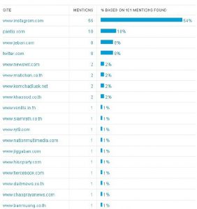 タイ国内を対象に、ヘアケア系のブランド名やコスメ関連のキーワードが出現しているSNSを見てみましょう。下の一覧は出現数が多い順に並べたものですが、やはりInstagramがダントツで過半数の54%を占めています。