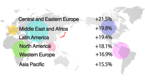 2020年地域別eコマース売上高の伸び率は以下の通りです。