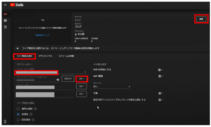 <エンコーダ配信の設定画面:ここからストリームキーを取得します。>
