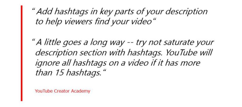 ハッシュタグを説明文に含めることでSEOの向上に役立つと言及されていますが、「動画に関連するハッシュタグであること」「15個以上のハッシュタグがある場合は、動画内の全てのハッシュタグは無視され、効果を失う」とのことですので注意する必要があります。