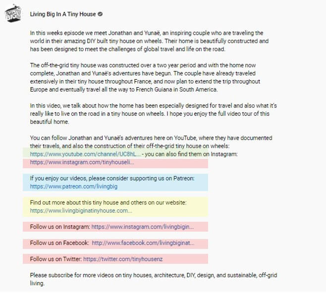 <ニュージーランド発、海外で人気の不動産紹介チャンネル「Living Big In A Tiny House」の説明文は、視聴者に対して次に起こしてほしいアクションと遷移させたいリンクが明確に挿入されています。>