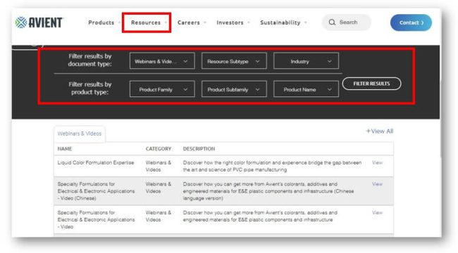 また、最上部ナビゲーションメニューの「Resourse」には、企業情報パンフレットを始め、テクニカルデータシート、安全データシート、ウェビナーや動画など、豊富なコンテンツが用意され、検索可能な機能を組み込むことで、誰でも容易に必要な情報を探し出せるように設計されています。