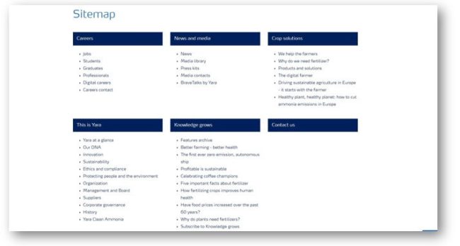 フッター部分には、「Sitemap」ページをがあり、徹底的に「明確なナビゲーション」を追求していることが伺えます。加えて、サイトTOPに表示されるメッセージ(黄枠)は、Yaraの「M.M.V(Mission,Vision,Value)」を明確に反映している優れたコピーであり、多くの人々の心を捉える、素晴らしいB2B多言語ウェブサイトと言えるでしょう。