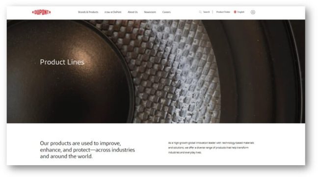 デュポンのウェブサイトは十分な余白と広いマージンを取り、装飾や華美な要素をできるだけ取り除いた美しいウェブサイトになっています。シンプルな配色・整理された外観・美しく最小限の画像と明確なキャッチコピーで、ユーザーをコンテンツに没入させるよう構成されています。