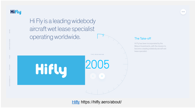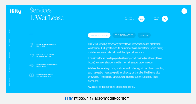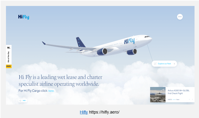 世界中で航空機のウェットリース(Wet Lease)を展開する「Hifly」のウェブサイトは、さまざまな要素が統合され、HiFlyのブランド価値を強化する魅力的で記憶に残るウェブ体験を提供しています。