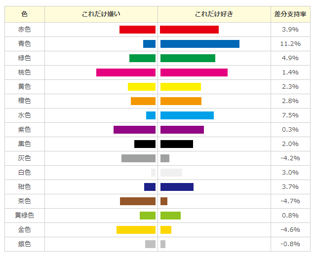 色の嗜好の統計データを扱う「色カラー」は、ネット上で日本人の色の好き嫌いについてアンケートをとり、約8万件のデータを集めました。