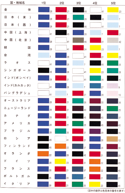 また、下図は、日本の色彩学の第一人者であり武蔵野美術大学造形学部教授でもある千々岩秀彰氏が報告した「色と心理」において「世界各国で好まれている色の一覧」です。