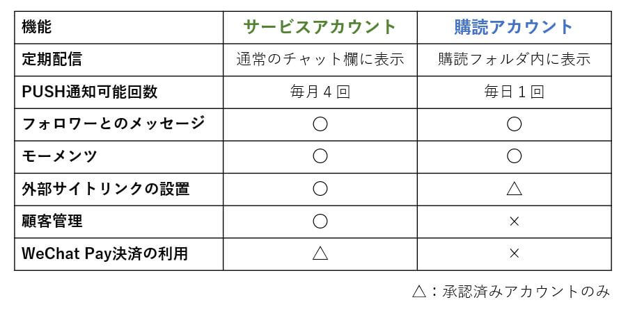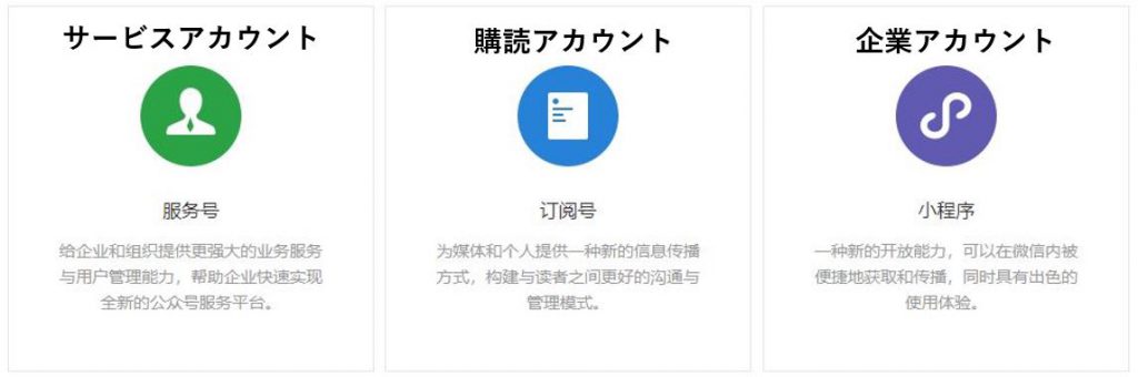 「WeChat/微信」公式アカウントには3つの種類があり、目的によって利用するアカウントが異なってきます。