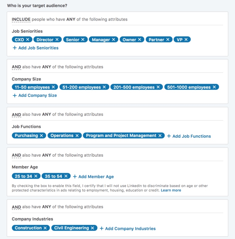 他のソーシャルメディアでは、ここまで詳細なユーザーデータを登録する必要もないため、転職プラットフォームとして利用されている LinkedIn だからこそ可能なターゲティングであり、LinkedInマーケティングがBtoBビジネスに有効であると言える大きな要素の一つです。