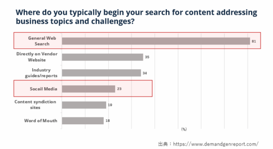 Demand Gen Reportの調査では、BtoBの購買担当者が情報収集に利用しているチャネルとして以下が挙げられています。